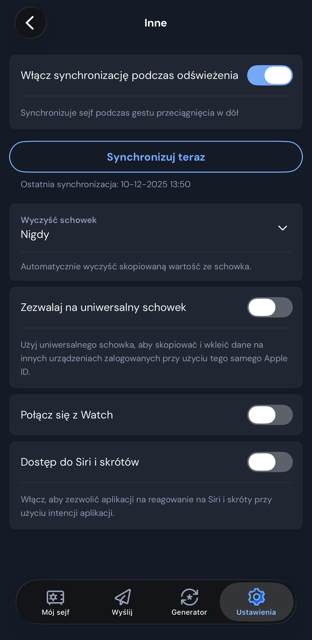 - Dla wygody włącz odblokowanie sejfu odciskiem palca / FaceID / kod PIN (zależy jaki masz telefon taką bedziesz mieć opcję) – ale pamiętaj, że nadal najważniejsze jest to długie hasło główne, czasem trzeba będzie je podawać ręcznie.