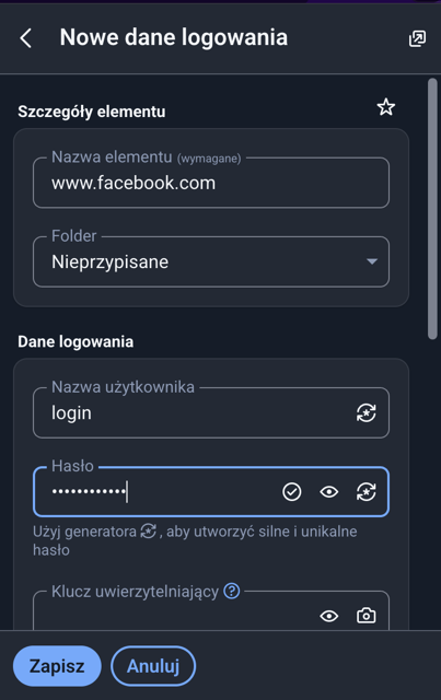 Wypełniamy podstawowe pola, czyli Nazawa konta, Nazwa użytkownika, Hasłow. Opcjonalnie dobrze jest wypełnić, jak znamy, Strona internetowa (URI) co pozwoli łatwiej i pewniej uzupełniać dane logowania (można to dodać później)
