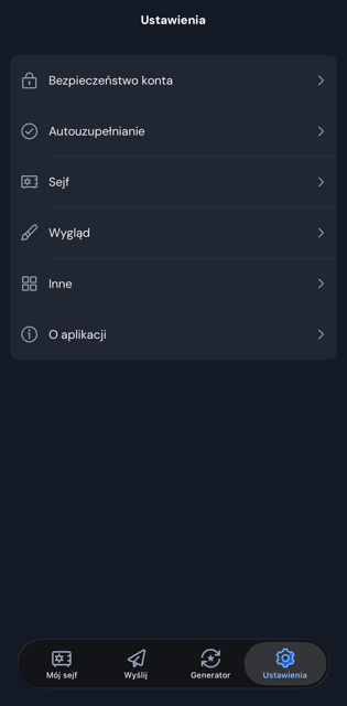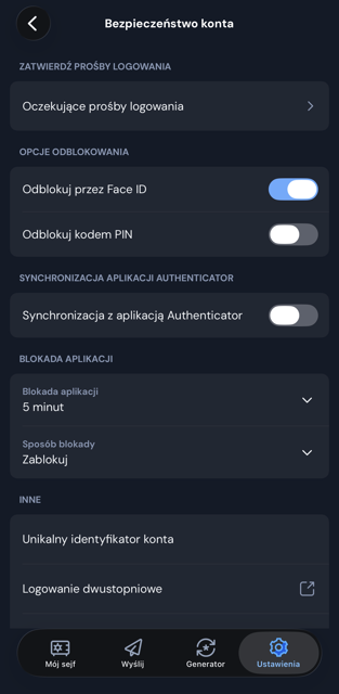 - Dla wygody włącz odblokowanie sejfu odciskiem palca / FaceID / kod PIN (zależy jaki masz telefon taką bedziesz mieć opcję) – ale pamiętaj, że nadal najważniejsze jest to długie hasło główne, czasem trzeba będzie je podawać ręcznie.