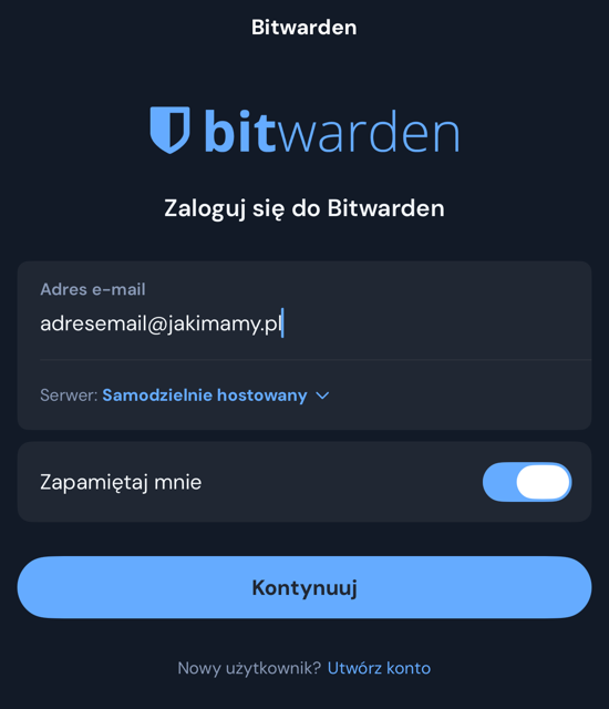 - Zainstaluj rozszerzenie Bitwarden w swojej przeglądarce i aplikację na telefonie, ustaw adres mojego serwera i zaloguj się.